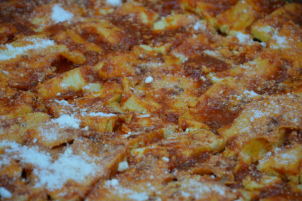 Preparazione del polentone il suo condimento, 4 porzioni di polenta cucinata.