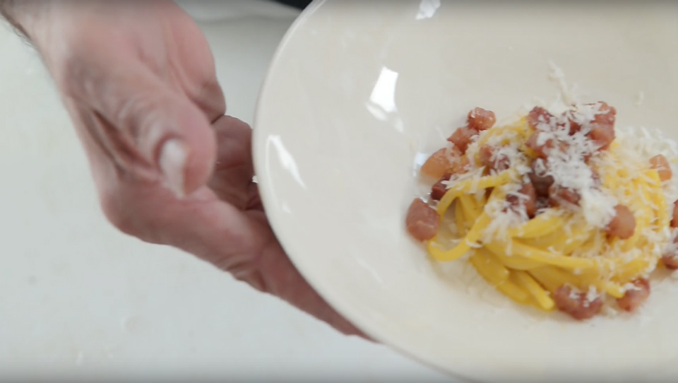 La Carbonara una delle ricette Classiche della cucina italiana interpretata dallo Chef pluristellato Mauro Uliassi Chef patron dell’omonimo ristorante di Senigallia per: Italia Squisita e Pasta Felicetti vedi il video in questo link… Mettere a cuocere la pasta in abbondante acqua salata. Mentre la pasta cuoce, far rosolare il guanciale, scolare e asciugare dall’olio in eccesso. A parte aromatizzare dell’olio extravergine con dell’aglio e altro guanciale tagliato sottile cucinandolo a fuoco basso. Filtrare l’olio in una bacinella d’acciaio inox e abbassare di temperatura, unire le uova e il formaggio girando con una frusta. Scolare la pasta versare nell’apparecchio di uova, olio e pecorino, mantecare con un po’ d’acqua di cottura e disporre nel piatto di portata. Guarnire con pepe macinato fresco, il guanciale e del pecorino. Italia Squisita Pasta Felicetti Uliassi