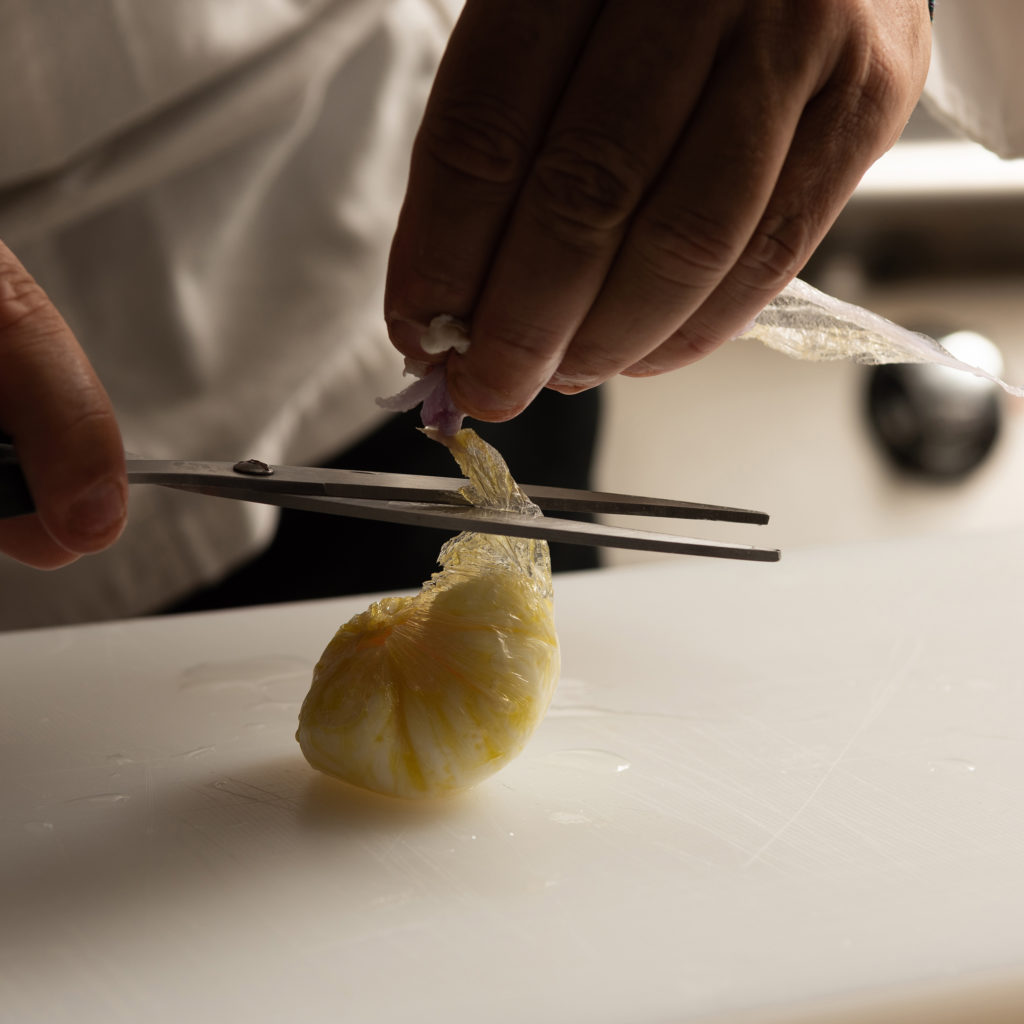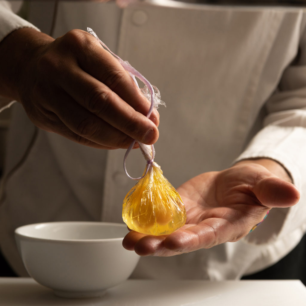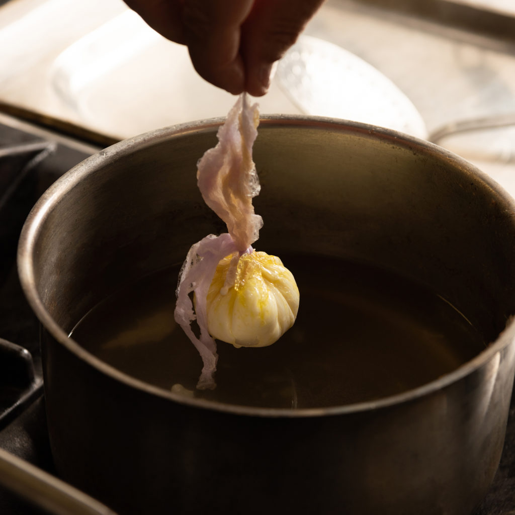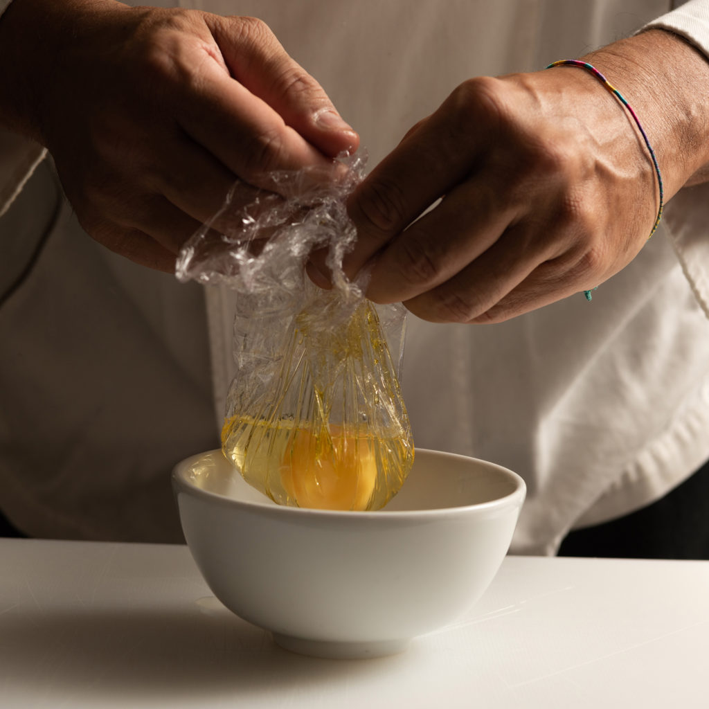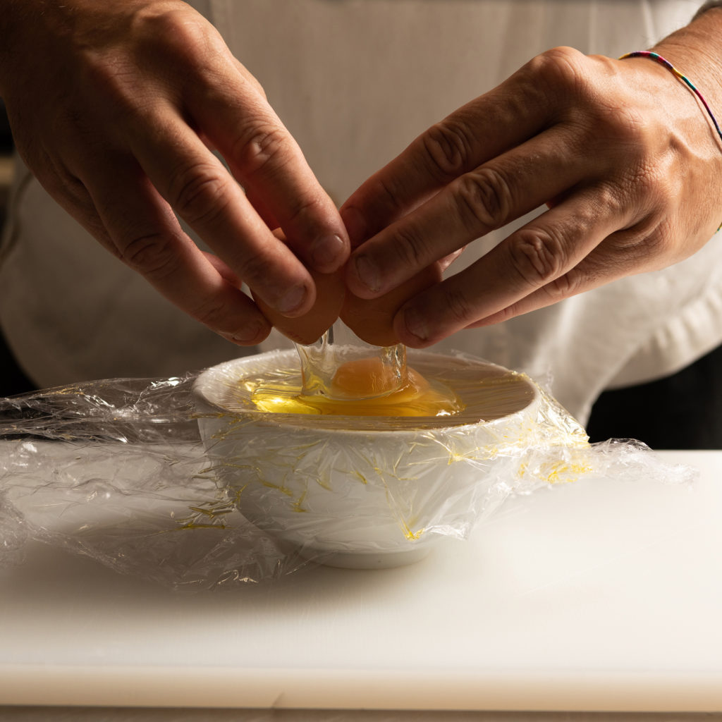 Spennellate di olio il centro di un quadrato di pellicola alimentare, adagiatelo su di una ciotola concava e rompeteci dentro un uovo. Chiudete la pellicola a sacchettino e cucinatela in acqua bollente per 3 minuti e mezzo.
