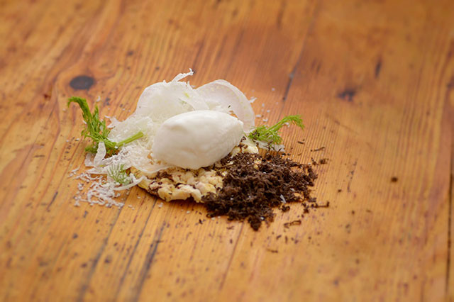 Lovers’ Pecorino ice cream with black truffle, fennel vinaigrette and corn “galletta 8 file”.