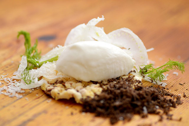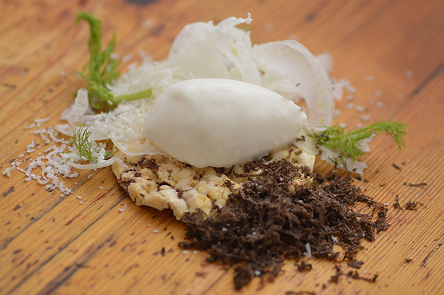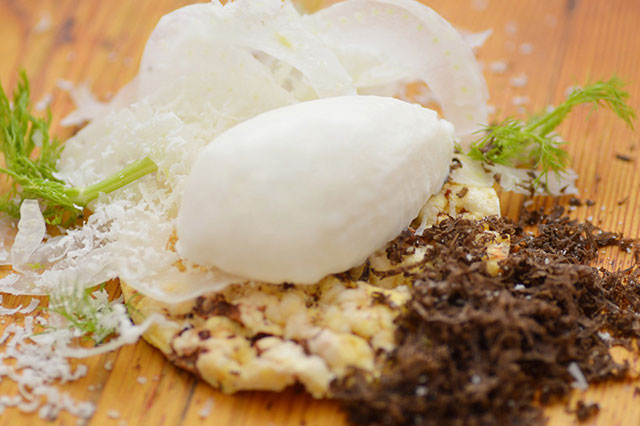 Gelato al pecorino degli amanti, con tartufo nero pregiato, finocchi in osmosi alla vinaigrette e galletta di mais 8 file.