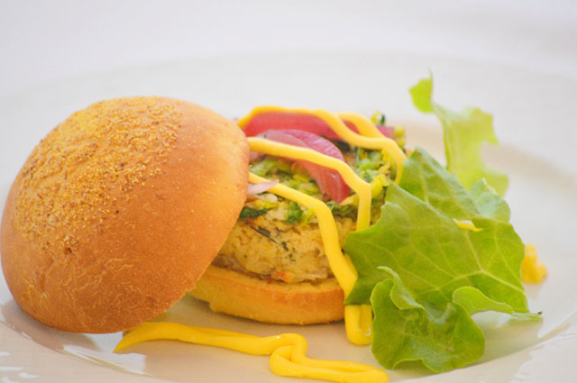 Unire il pecorino grattato ed aggiustare di sale e pepe;dare forma di burger.. e panarlo esternamente con gallette di mais sbriciolate e rősti di patata.