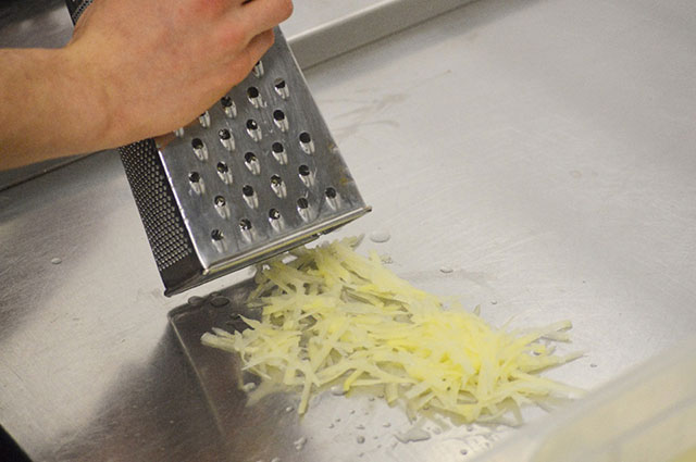 Grattare le patate crude e realizzare dei rősti ( dischi di patata grattata e fritta in olio );