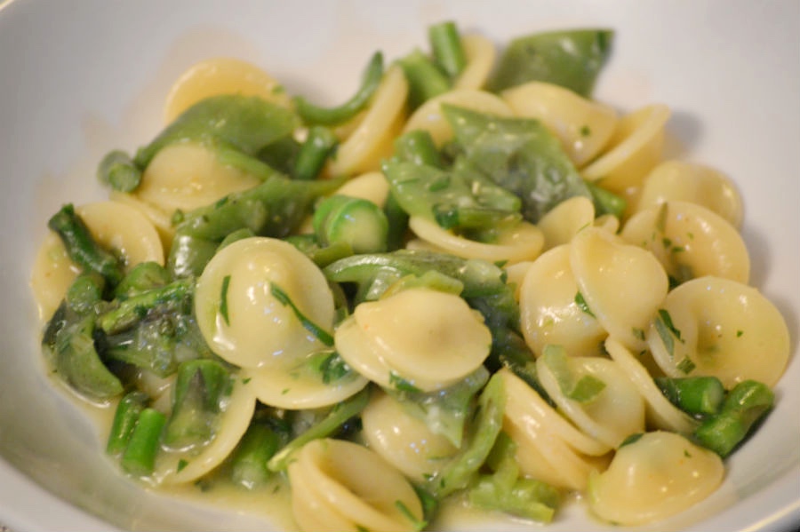 Portate a ebollizione una pentola d’acqua, cuocetevi per 5 minuti i baccelli, scolateli, quindi salate e cuocete la pasta nella stessa acqua di cottura.