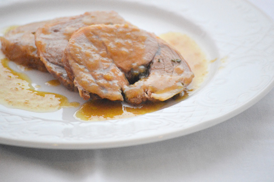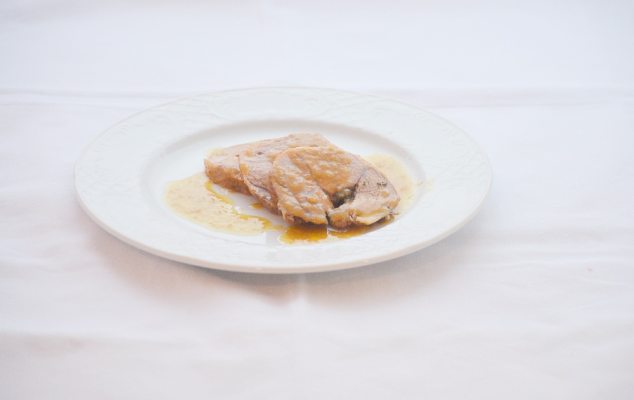 Condire il cosciotto con sale e pepe, succo di limone, il burro mantecato, arrotolare e legare con lo spago.