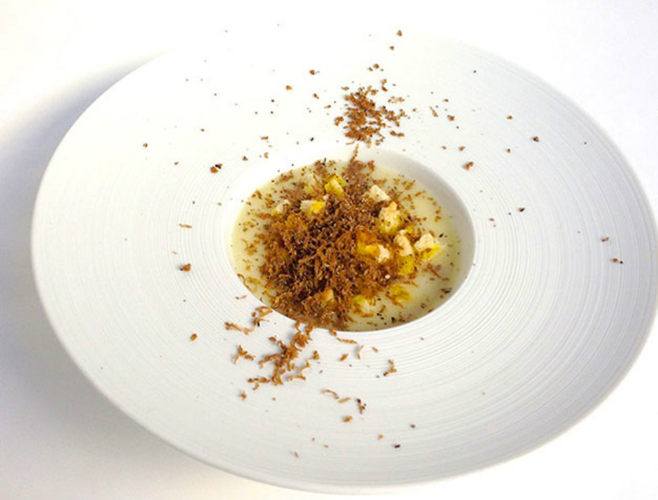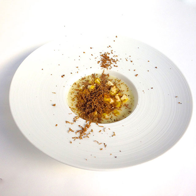 Cauliflower cream, mazzancolle and black truffle of Acqualagna Tartufi.