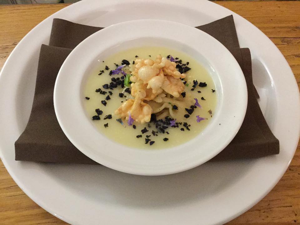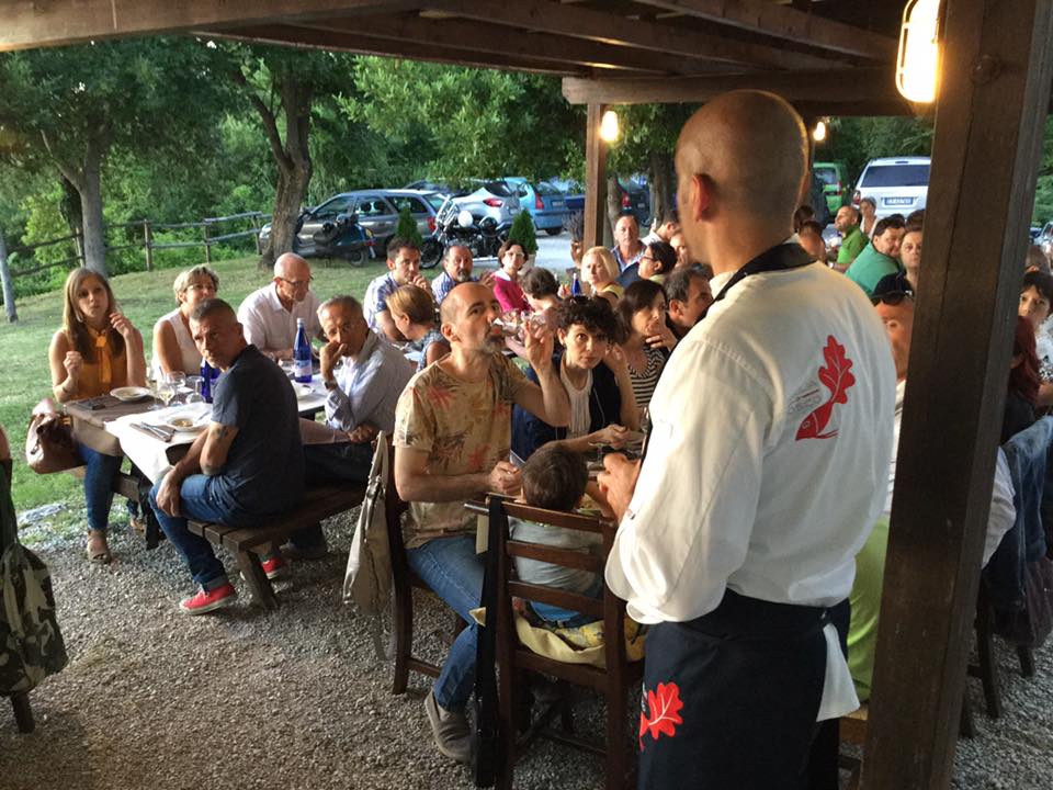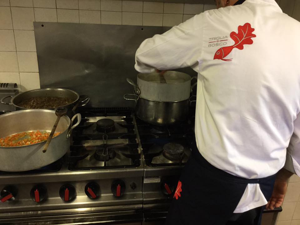 La manifestazione organizzata da Ais delegazione di Urbino-Montefeltro, SlowFood e Tenuta Montebello presso l’Agriturismo Girolomoni, gli Chef del territorio, hanno sviluppato ricette con le paste prodotte con i grani antichi.In questa sfida culinaria si sono misurati: Nicolò Palazzetti Master chef Junior Rachele Palazzetti vincitrice Chef in the city 2014 Antonio Palella vincitore Chef in the city 2013 Il ristorante la Ferraia di Pianello di Cagli Il ristorante il Gatto e la Volpe La Trigliadibosco la conoscete Prima di mostrarvi il piatto ma soprattutto la ricetta che ho realizzato per la serata vi presento la tenuta Girolomoni… Dalla Locanda Girolomoni, nel più totale relax, si può spaziare con la vista dal monte Carpegna a S. Marino fino al mare di Cattolica, una vera gioia che rinfranca lo spirito. Al piano superiore la Locanda dispone di sei camere per un totale di 20 posti letto, un ristorante per 60 persone al chiuso e un pergolato esterno per 50 persone affacciato su uno splendido panorama con accanto una piscina (trattamento acqua con sale). Organizziamo su prenotazione anche pranzi e cene per matrimoni, comunioni, feste di laurea, convegni, ritiri spirituali… tutto a base di prodotti bio naturalmente. Possibilità di pagamento anche con carta di credito. Inoltre nella locanda si possono acquistare i prodotti biologici della Cooperativa Girolomoni. La cucina da Pasqua a settembre è aperta tutti i giorni sia a pranzo che cena. Da ottobre a marzo è aperta durante la settimana solo a pranzo, cena su prenotazione; sabato e domenica pranzo e cena; chiuso il lunedì. Mese di chiusura gennaio. Per informazioni telefonare alla Locanda Girolomoni: 0721/720126 – 339 8270755 Ecco le parole di Guido Ceronetti, ospite abituale della Locanda: “La locanda non punta decisamente sulla cucina alternativa (naturista-vegetariano-macrobiotica) perché solo nei grandi centri è possibile, per un’iniziativa del genere, avere clientela sufficiente, ma chi ne va in cerca dev’essere informato che là, richiedendola, anche negli aspetti di stretto regime dietetico (guerra personale al colesterolo) la trova. Si può anche avere il latte di soia, un vero salvagente, e non molto diverso di sapore da un comune latte magro di Centrale. La richiesta del Tamari o del Gomasio non lascia chi vi serve a bocca aperta, come succederebbe in un ristorante da cento o duecentomila al colpo. Il Cous-Cous, prodotto direttamente dalla Cooperativa, è incontestabilmente il migliore che esista. I prodotti usati sono onesti su entrambi i versanti, perché non sono di provenienza industriale e, quando la stagione lo consente, le verdure sono di orti locali. Il vino è controllato e, per quel che può dirne un non-bevitore, raccomandabile, sia rosso che bianco. La pasta è per tutti integrale o semintegrale, il riso è biologico, anche se fatto col ragù. Il pane è eccellente e se ne può avere anche un tipo speciale, cotto a legna, quando si sia al massimo esigenti. Di questa locanda sono più spettatore che attore di memorabili mangiate. I marchigiani sono forchette impressionanti: il doppio piatto di pasta lascia sbigottiti e mi dicono che è normale. Ma bisogna anche lì, come in ogni cosa, avere ambizioni: inventare, aggiungere, perfezionare, non accontentarsi del buon livello raggiunto. Qualche raffinatezza in più non guasta anche in un quadro di semplicità: è questione di tocco, di sensibilità. Neanche un luogo dove si mangia vive ‘di solo pane’.”. Crema di patate al limone Pulire le patate, tagliare a cubetti e mettere a cuocere con il brodo. Unire il burro, il parmigiano, il succo di limone e frullare il tutto con il minipimer Regolare di sale e curcuma. Mazzancolle arrostite Pulire le mazzancolle, tagliarle in tre parti. Scaldare in una padella antiaderente l’olio, unire le mazzancolle e gli odori regolare di sale e scorza di limone grattugiata. Cuocere g 200 di farfalle in abbondante acqua salata, scolare al dente, terminare la cottura in padella con olio e acqua di cottura. Mettere nel piatto la crema di patate, al centro disporre le farfalle e le mazzancolle, cospargere con curcuma fiori di lavanda e pane al nero di seppia tostato.