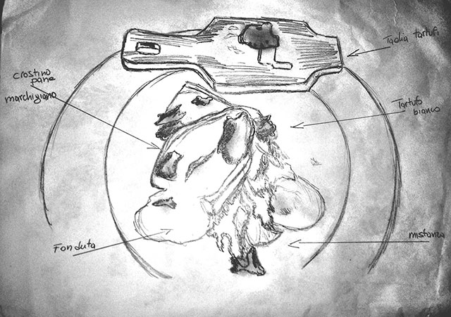Disporre le fette di pane sul piatto di portata cospargere con la salsa decorare con l’insalata lavata centrifugata ricoprire con tartufo bianco d’Acqualagna affettato al momento e servire ben caldo.