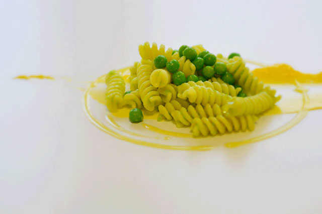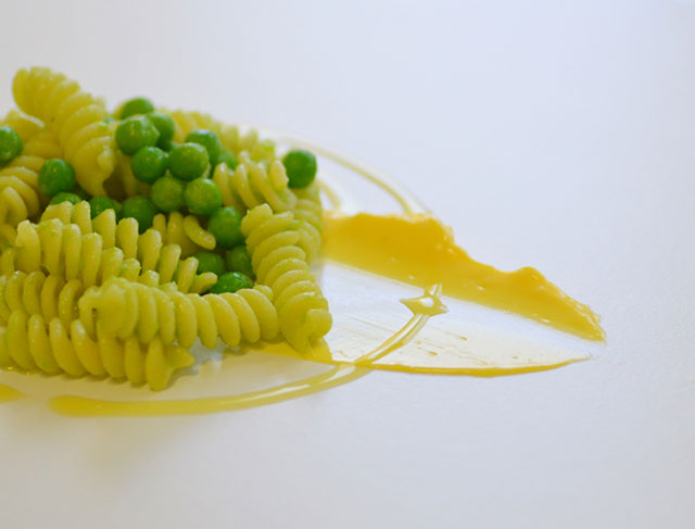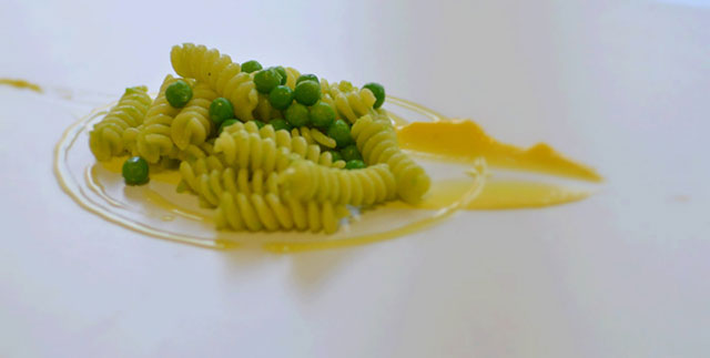Cuocere la pasta al dente, scolare in un saliere aggiungere la crema di piselli i piselli tenuti da parte, amalgamare con l’aggiunta di pecorino grattugiato.