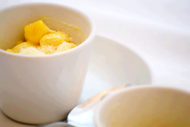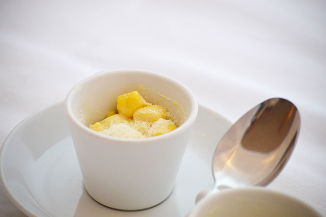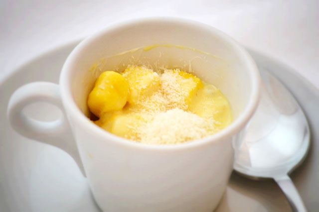 Imburrare delle cocotte sistemare della salsa mornay ( vedi ricetta besciamella alla quale sono stati aggiunti parmigiano, panna fresca, rossi d’uovo e porro fatto appassire in padella antiaderente con un po’ di burro), sistemare gli gnocchi, appare con altra salsa mornay e parmigiano grattugiato.