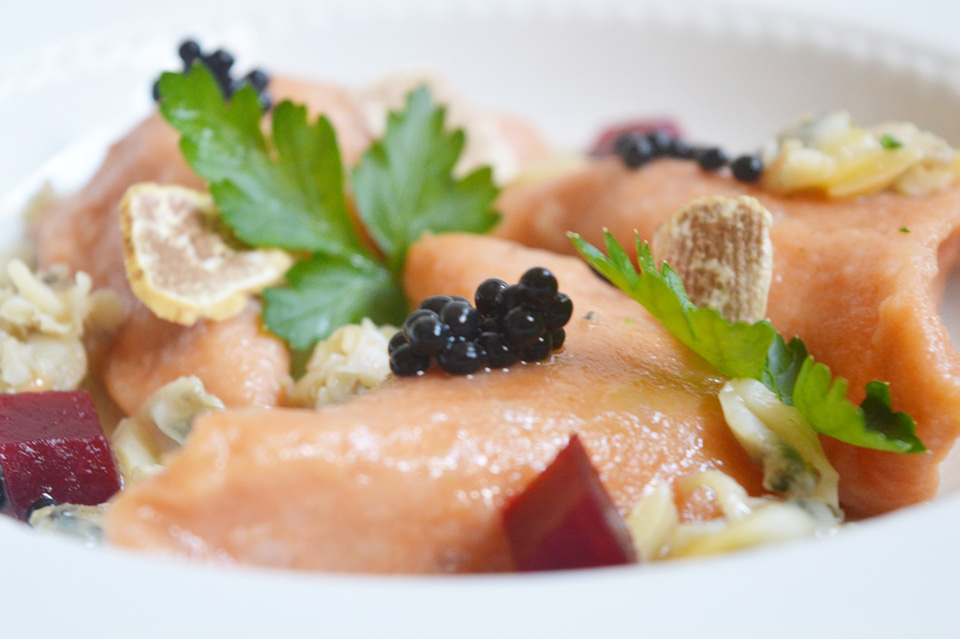 La zona di Piobbico e la Valle del Candigliano sono culle del Tartufo; da quello bianco al nero pregiato, dal tartufo estivo al tartufo bianchetto. In questa zona opera l’Azienda Tartufi Alessandro Rossi, che ogni giorno, seleziona i migliori tartufi dalla propria rete di “cavatori” e li esporta in tutto il mondo anche sotto forma di prodotti derivati, collaborando anche con i migliori Chef Italiani. Grazie all’efficiente servizio di spedizione, l’azienda è in grado di rifornire chiunque, in Italia e nel mondo, sia di prodotti conservati che di tartufo fresco. Tartufi Alessandro Rossi offre la possibilità di acquistare i prodotti del territorio, dal tartufo fresco alle specialità a base di tartufo e funghi lavorati secondo antiche ricette con gli ingredienti più genuini e naturali. Gnocchi di rapa rossa ripieni, con vongole e perle di tartufo. Per gli gnocchi: Lavate e mettete a lessare le patate in una pentola, ricoprendole con acqua fredda. Quando le patate saranno cotte, scolatele dall’acqua e passatele o nello schiacciapatate o nel passaverdure (in questo caso, pelate le patate prima di passarle). Quindi versatele sul tagliere ed apritele a fontana, aggiungete la farina, l’uovo, la rapa rossa frullata, la noce moscata, il parmigiano e il sale. La lavorazione dell’impasto, deve essere molto veloce, altrimenti le patate tendono ad ammorbidirsi troppo. Infarinate il tagliere ed appoggiate l’impasto in un angolo. Ora, prendetene una parte e formate un rotolino largo come un dito. Con un mattarello, appiattite il rotolino, fino a formare una striscia larga 3-4 dita, tagliate con il coppa pasta, mettete al centro una pallina di ricotta precedentemente aromatizzata con erba cipollina, scorza di limone, sale fino e pepe nero, quindi chiudete a caramella. Salsa alle vongole: Q.b. Tartufo Bianco pregiato d’Acqualagna di Rossi Tartufi (il tartufo bianco pregiato, può essere sostituito, a seconda della stagione, con il nero pregiato o l’estivo). Procedimento: Per prima cosa, controllate che le vongole non contengano sabbia: picchiettatele una ad una su un tagliere, dalla parte dell’apertura. Eliminate anche quelle che presentano il guscio rotto. Poi ponete le vongole in un colapasta, poggiato su una ciotola e sciacquatele più volte sotto acqua corrente: terminate quando nella ciotola non si vedrà più sabbia. Versate un filo d’olio in una pentola, con l’aglio pelato, diviso a metà e privato dell’anima. Fatelo rosolare qualche minuto.Versate nel tegame le vongole, coprite con il coperchio e accendete fuoco. A questo punto, a fuoco vivace, aggiungete il brodo, il ché, grazie al calore, farà aprire le valve. Dovrete spegnere il fuoco, immediatamente dopo la completa apertura, ciò per evitare che si asciughino troppo e venga compromessa la tenerezza del frutto di mare, con una cottura troppo prolungata. Filtrate il liquido così ottenuto al colino cinese, nel quale avrete sistemato un panno di lino, sgusciate le vongole, sciacquatele e mettetele con la salsa filtrata. Fate cuocere gli gnocchi in abbondante acqua salata, scolate e saltate con le vongole la loro acqua, unite il prezzemolo tritato, la scorza e succo di limone, quindi servite con le perle di tartufo e lamelle di bianco pregiato. L’azienda Rossi Tartufi vi ricorda che questo fine settimana ( 17/10/2015-18/10/2015 )sarà presente alla Firera Nazionale del tartufo di S.Angelo in Vado, in provincia di Pesaro e Urbino, con i suoi prodotti freschi e preparati, per offrirvi assaggi e vendita delle prelibatezze tipiche del territorio marchigiano.Contatti Dettagli Via I Maggio, 61046, Piobbico (PU) +39 0722986241 info@tartufi-rossi.com Traduzione di: Roberta Guidi rguidi@email.it 3391963583 Pentole TVS Piobbico and the Candigliano Valley are cradles of the Truffle; from the precious white truffle to the precious black truffle, from the summer truffle to the “bianchetto” truffle. Tartufi Alessandro Rossi selects the best truffles thanks its own circle of truffle hunters “cavatori” and exports its products all over the world , working in partnership with the best Italian chefs. Thanks to the efficient delivery service , the Company dispatches both fresh truffles and preserved products in Italy and abroad. Tartufi Alessandro Rossi offers you the opportunity to purchase the products of the territory; from fresh truffle to truffle and mushrooms based specialities, prepared according to antique recipes with the most genuine and natural ingredients. Beetroot gnocchi (potato dumplings) stuffed with clams and pearls of truffle. Gnocchi: