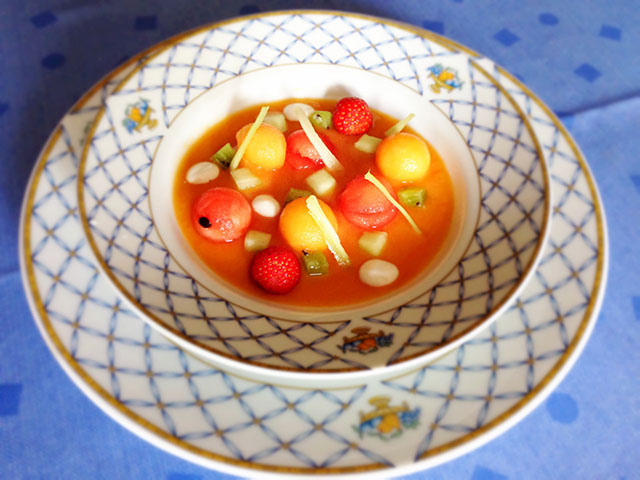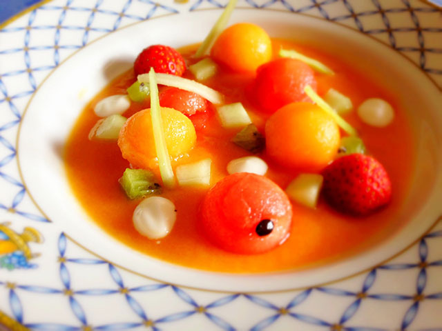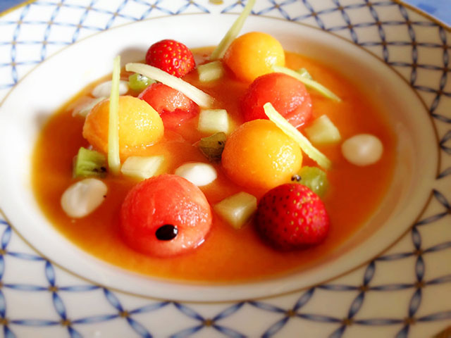 Con uno scavino realizzare delle palline con melone e cocomero, alternare nel piatto.