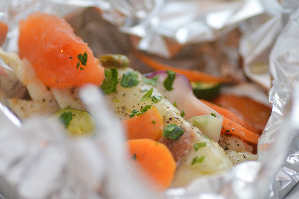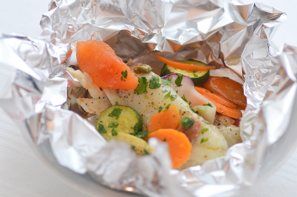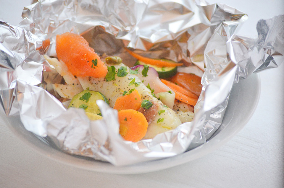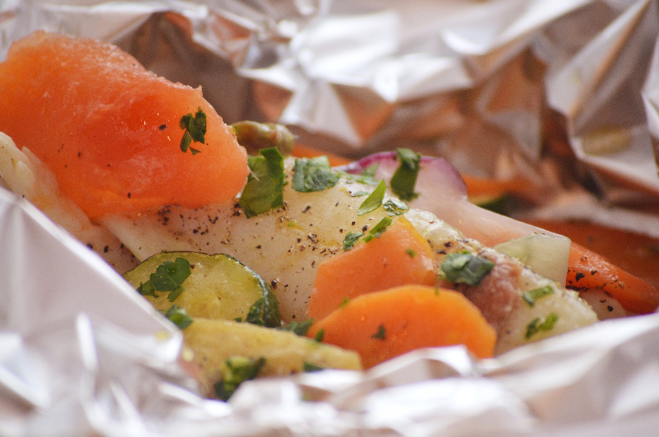 Pulire l’orata, eliminare le pinne asportare le squame e le interiora. Lavare molto bene sotto acqua corrente. Sfintere ed eliminare le spine con le pinze da pesce. Pulire e mondare le verdure. Tagliare le carote, le zucchine e il sedano a losanghe, tagliare i pomodorini a meta. Saltare separatamente in padella antiaderente con un filo d’olio zucchine carote e sedano, salare e pepare. Disporre in ogni foglio di stagnola 2 filetti d’orata salare e pepare, aggiungere le carote, il sedano, le zucchine i pomodorini precedentemente conditi il basilico spezzettato con le mani, taglio privato deli’anima, bagnare con il vino bianco e un filo d’olio extra vergine, chiudere il cartoccio e sistemare in una placca. Cuocere in forno a 180°C per 15 minuti, servire ben caldo e aprire davanti al cliente. Ps si può aggiungere anche un po’ di prezzemolo tritato e cipolla rossa