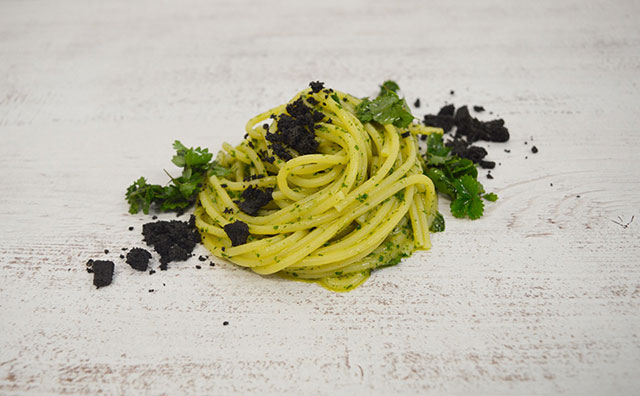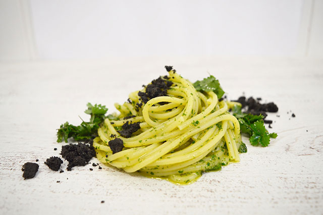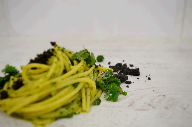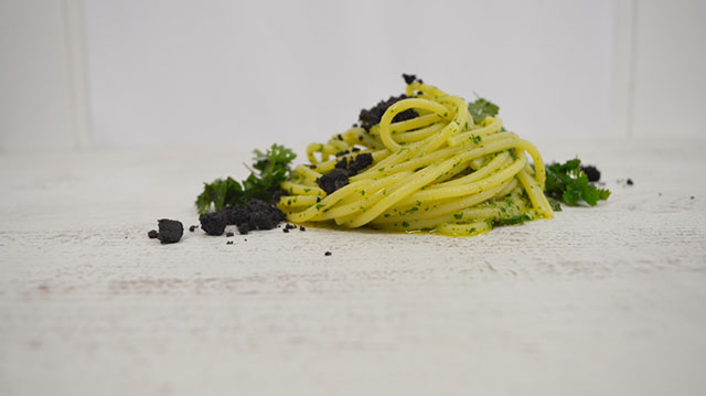 Mettere le foglie di pimpinella nel mixer con l’olio i gherigli di noci, i pinoli, il pane raffermo, il parmigiano. Frullare bene tutto fino ad ottenere un pesto abbastanza fine. Meglio iniziare con le lame le mixer fredde, così non si surriscalda il pesto, magari si possono tenere un pochino di tempo in freezer prima di iniziare.