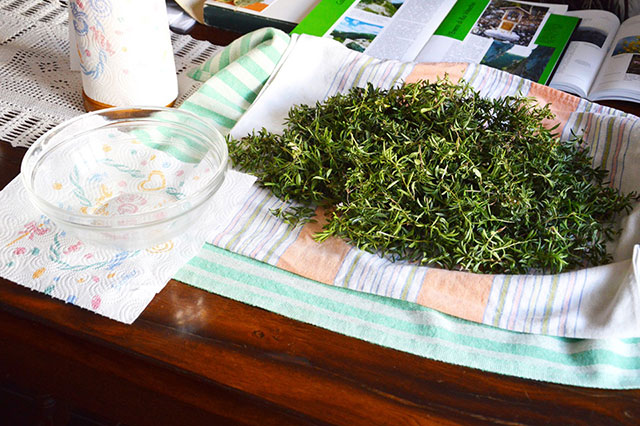 Lavate accuratamente le foglie di Santoreggia, togliendo la parte legnosa, e asciugatele bene.