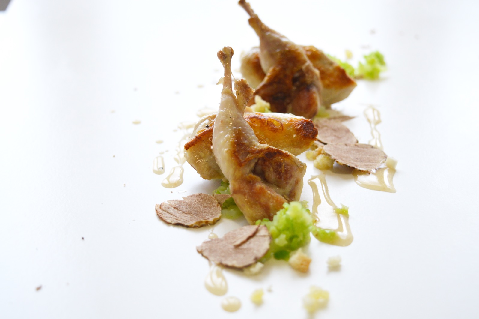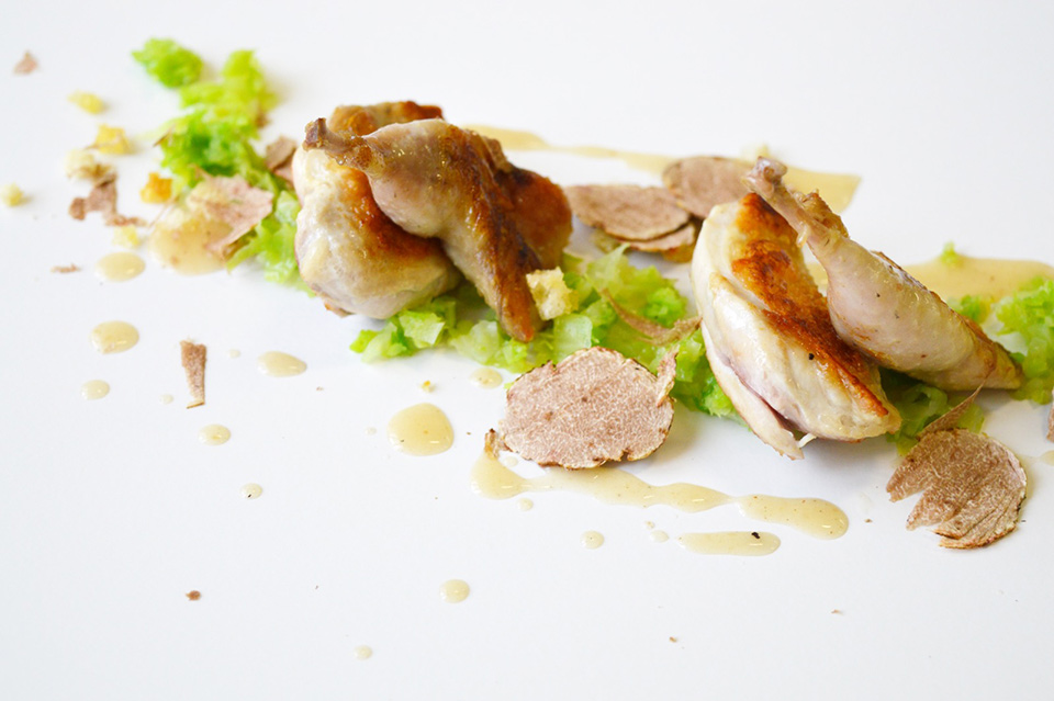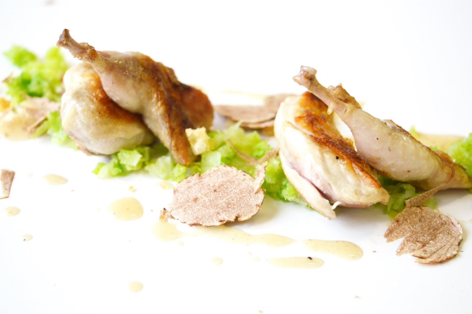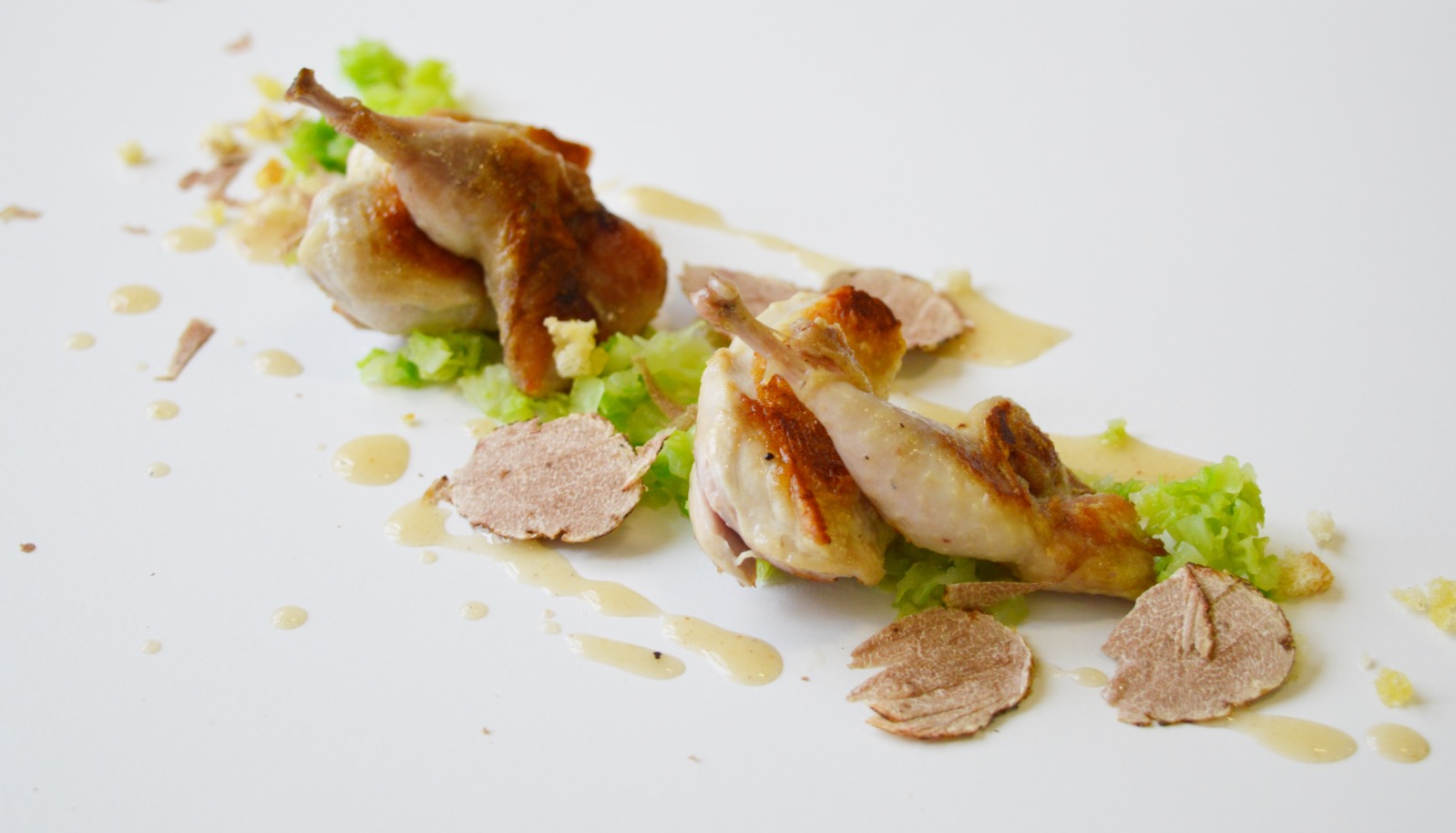 Quaglie arrostite, con verza ripassata e mostarda al tartufo.