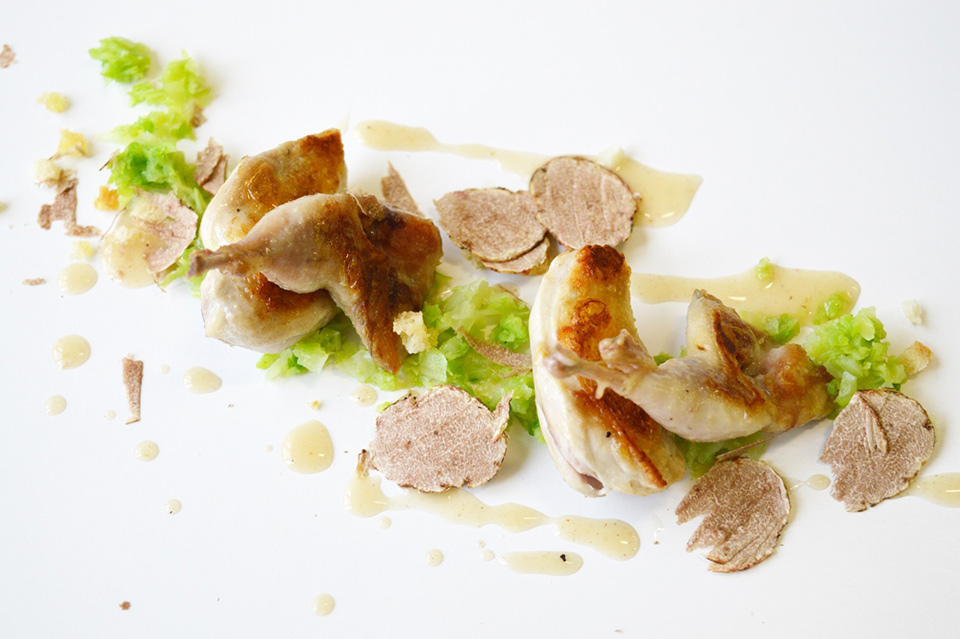 Roasted quails with stir-fried savoy cabbage and truffle mustard.
