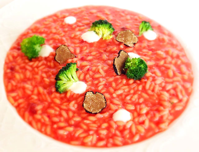 Disporre il riso nel piatto di servizio, decorare con lo yogurt le cimette di cavolfiore e lamelle di tartufo nero pregiato Tartufi Rossi.