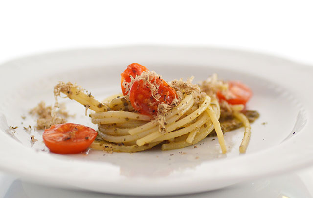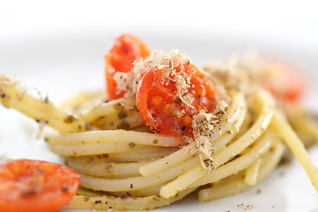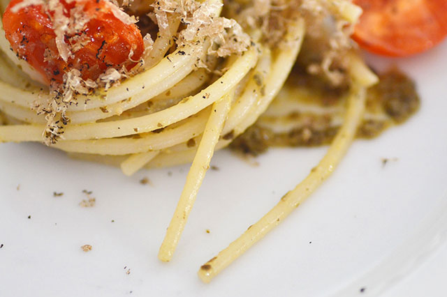 Pesto spaghetti with summer black truffle of Tartufi Rossi