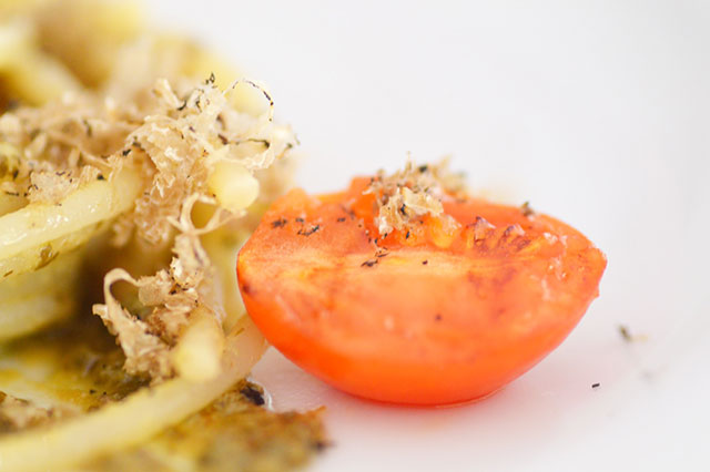 Disporre nei piatti di portata, aggiungere i pomodorini arrostiti e cospargere generosamente di tartufo nero estivo di Rossi Tartufi, tagliato alla microplane.