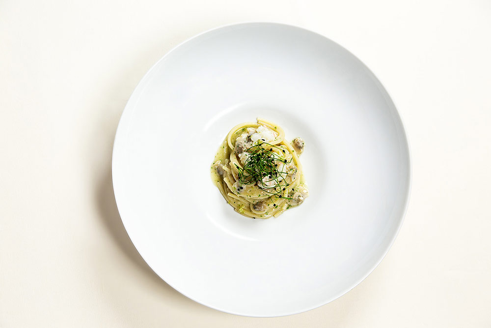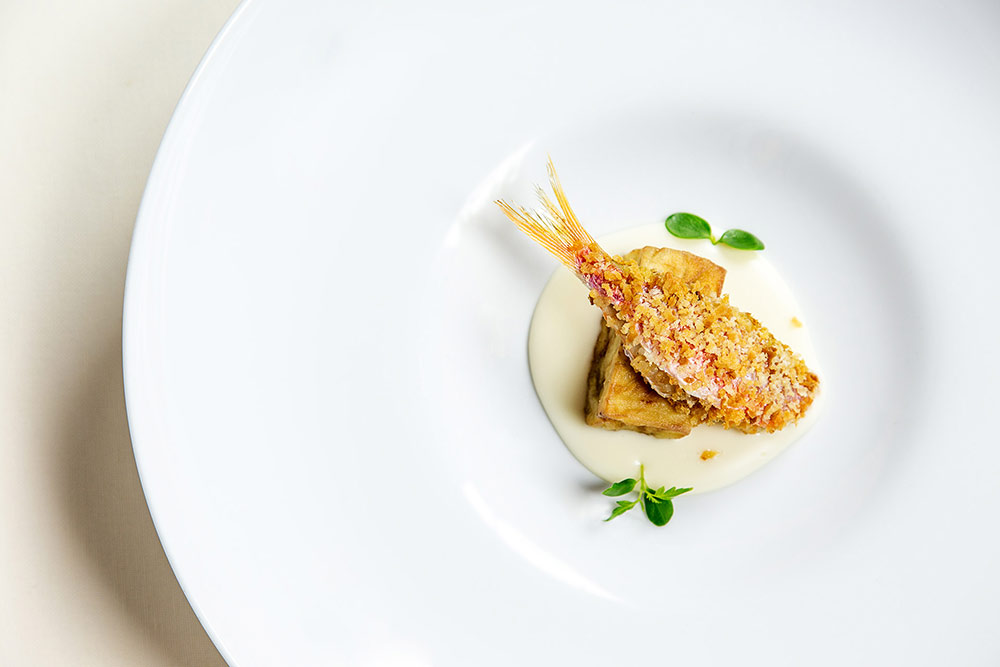 Sgusciare ed eliminare l’intestino degli scampi. Aprire l’ostrica e tritarla, conservando la sua acqua. Sbianchire le vongole in acqua bollente e raffreddare con il ghiaccio. Aprirle con l’ausilio di uno spelucchino, facendo attenzione a non romperle. Fare un fondo con olio, peperoncino e cipolla, sfumare con acqua di vongole; scolare lo spaghetto al dente e mantecarlo in questo fondo; aggiungere la crema di aglio, scampo vongole e l’ostrica. Spolverare, una volta impiattato con il lime. Siamo al Ristorante lo Scudiero di Pesaro, dove i titolari Daniele Patti e Matteo Ambrosini con Dunia Donini (moglie di Daniele) e Ivan Filanti sommelier gestiscono in armonia questo ambiente magico. Vi lascio qualche informazione utile sul Ristorante: Prendete Nota Il giorno di chiusura è il lunedì I menu proposti: Degustazione: 85 euro per 10 corse (da non perdere) 45 euro per otto corse di pesce 45 euro per otto corse di carne Lo Scudiero a 80 coperti ma è specializzato anche in matrimoni 200 coperti interni 300 coperti giardino. Non perdetevi la Triglia croccante (mi piace rimanere in tema con il blog), melanzana ripiena di pomodoro confit e provola. Un ristorante del cuore di questi giovani è: Uliassi (come dargli torto dico IO) Come novità del 2016 possiamo certamente citare il menù tutto nuovo, sia nella forma che nel contenuto, tutto firmato dal nuovo logo PATTI’S COOKING STYLE Inoltre la carta dei vini è stata ampliata, grazie ad una ricerca minuziosa in tutta Italia, di cantina in cantina per accostare ai grandi vini una selezione di prodotti ottimi ed esclusivi. I nuovi piatti sono numerosi, posso citarle: – Canocchie in porchetta – Tonno salsa tzatziki e mela cedrina – Pasta e fagioli di mare – Gli scampi che amò Rossini – Calamarata di crostacei TRIGLIA CROCCANTE, RIPIENA DI POMODORO CONFIT E PROVOLA.