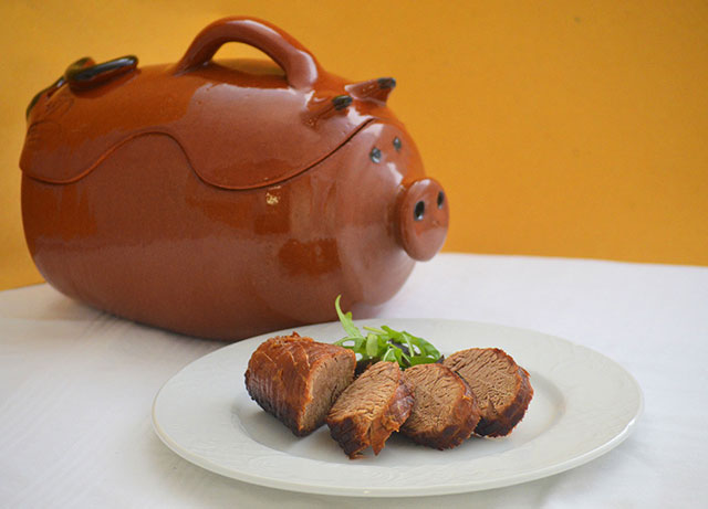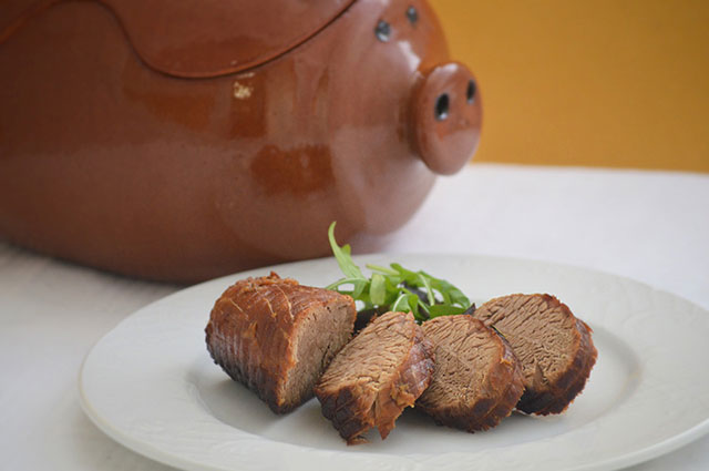 Scottare la carne in tutti i lati in una padella antiaderente, sistemare nel maialino con l’aggiunta di sedano, carota, cipolla tagliati in mirepoix, olio extravergine d’oliva il succo dell’arancio.