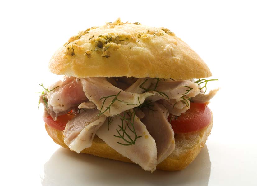Farcire i panini caldi con una fetta di pomodoro, uno scalogno caramellato, un po’ di crispi di cotenna.